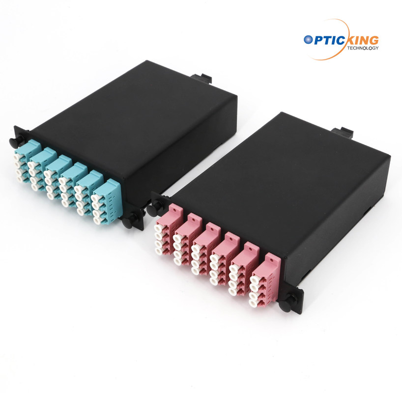 The OPTICKING MTP/MPO transition cassettes are a kind of breakout/fanout MPO cable assembly packaged in Plug-and-Play (PnP) LGX cassette boxes with adapters outside, ideal for connecting multi-fiber MTP/MPO trunk cables and splitting them out to various patch cables. Each cassette comes fully populated internally with pre-terminated and tested MPO hydra breakout/fanout cables, designed for fast and easy field installation with minimal training. These cassettes meet the demands of 10G/25G Ethernet, higher speed 40G/100G Ethernet, and can be used for standards-compliant cable plant migration from 10G/25G to 40G/100G. The Opticking transition cassettes are fully configurable, available with a variety of cable and connector combinations, including connector/adapter type, and jacket material. With highly integrated design and manufacturing capability, Opticking provides customized MTP/MPO transition cassettes which are 100% tested to deliver optimal performance and reliability.